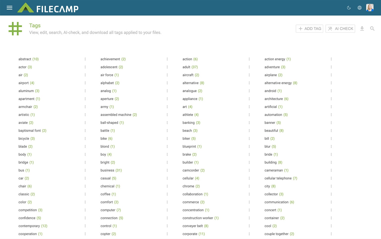 You will see a list of every tag in your account. Each tag shows how many files it is applied to. This includes both manually created tags and AI-generated tags.